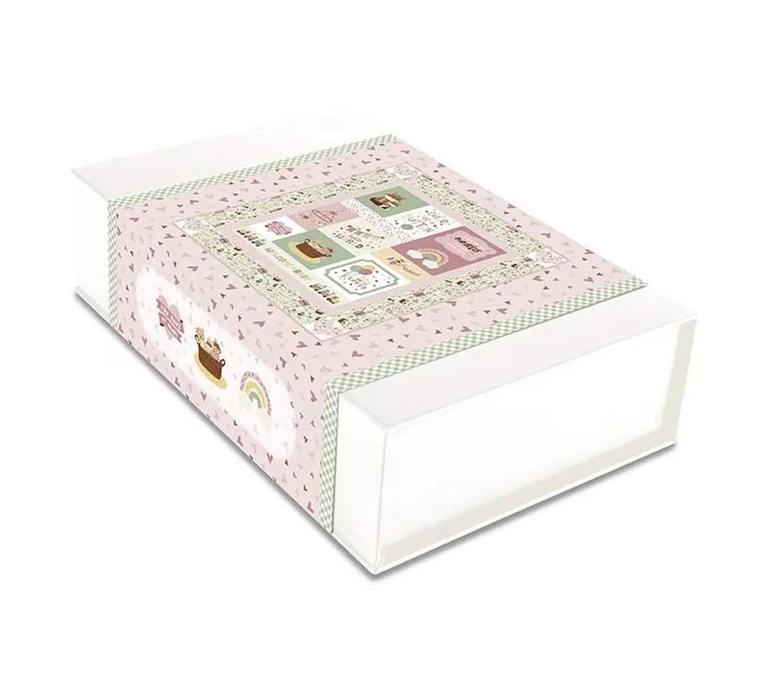The Cute as a Button Girl Panel Quilt Kit includes pattern and fabric for quilt top and binding. Backing not included. Fabric featured is Baby Boy by Lori Whitlock. Pattern is by the RBD Designers. Finished size is 52" x 60". Kit comes in a solid box with a printed belly band label. Box size is approximately 6" x 10" x 2 1/2".