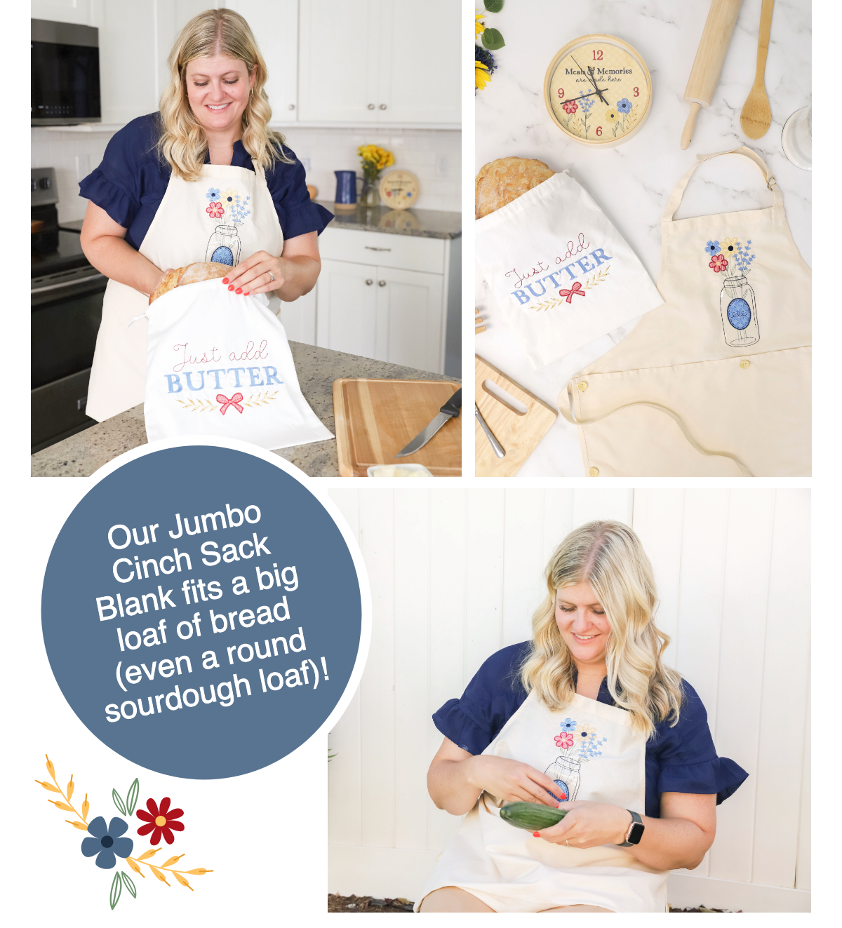 Everything’s better when you Just Add Butter! At Kimberbell’s one-day machine embroidery event, you’ll make three functional projects with a cottagecore feel: the Meals & Memories Clock, the Just Add Butter Cinch Sack, and a Mason Jar Bouquet Apron with roomy pockets! With a variety of fresh techniques, Just Add Butter is your recipe for fun.