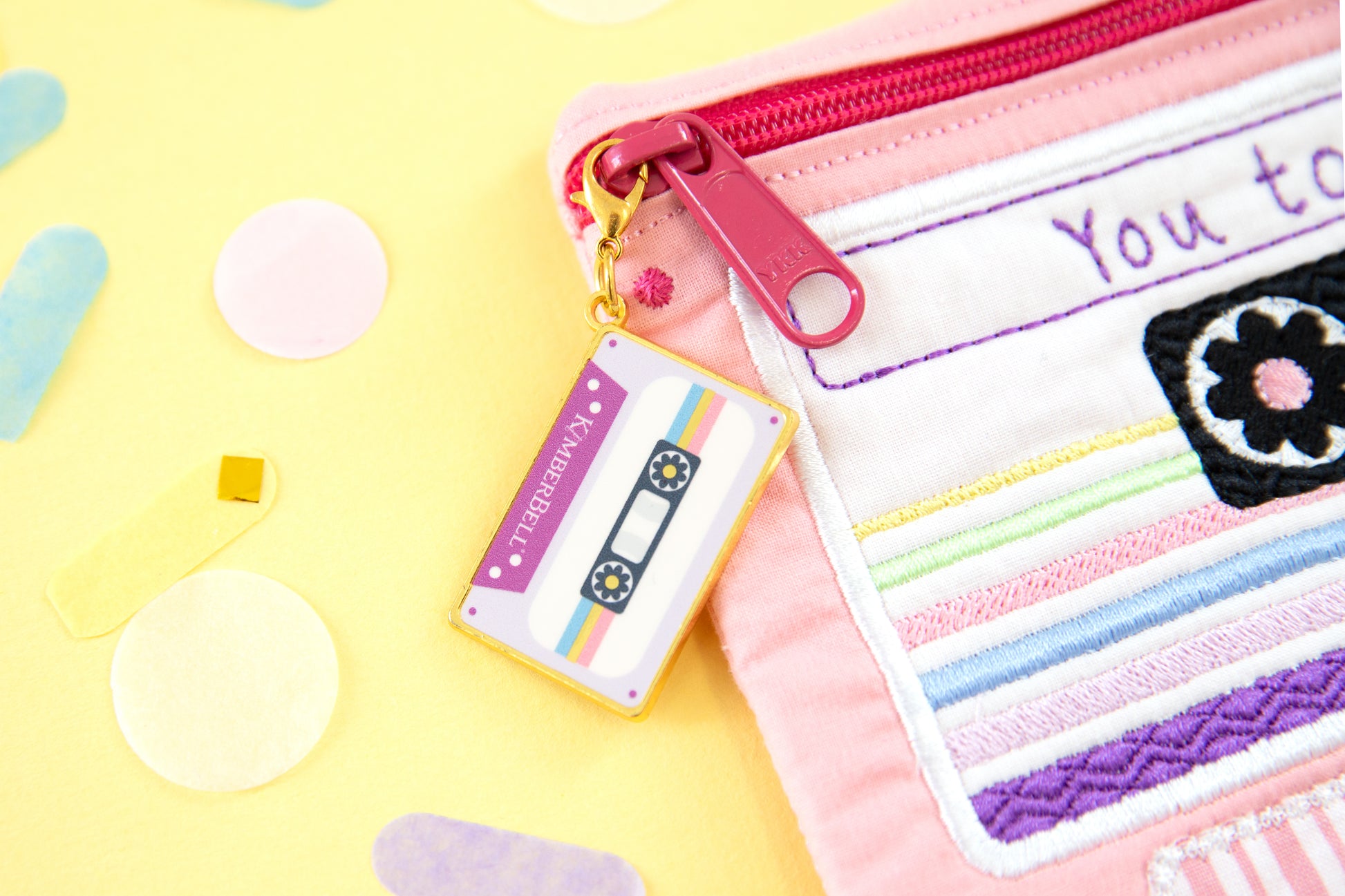 Kimberbell's Stitchin' Rewind 80's Zipper Charms. Our pack of three includes a flower, a mixed tape and a roller skate to delight your 1980's soul. With a lobster clasp and darling detail, these charms are "totally tubular" touch for pouches, purses and more.