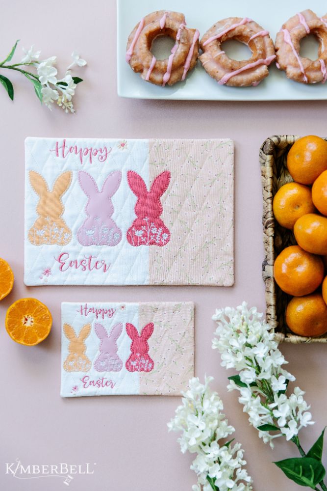 Kimberbell Digital Dealer March 2023 - Bunny Silhouette fabric kit to make a (2) 5” x 7” mug rug (as long as you don’t cut your applique pieces as you go). Kit includes all fabric for the front and back, batting and specialty fabric for the light pink bunny.
