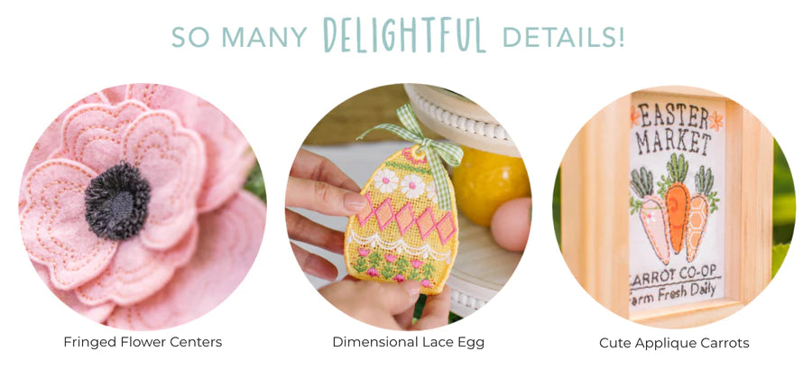 Enjoy stitching the Bunny Basket, Bunny Profile Stuffie, Carrot Co-op Frame, Felt Anemone, Felt Daisy, Lace Egg, Bunny Kisses Mini Pillow, and a Dimensional Quilted Carrot at the event.